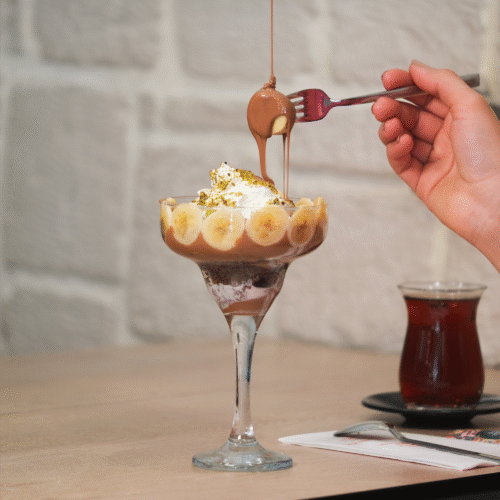 Eritilmiş sütlü belçika çikolatası, brownie parçaları, muz, antep fıstığı ve krema.