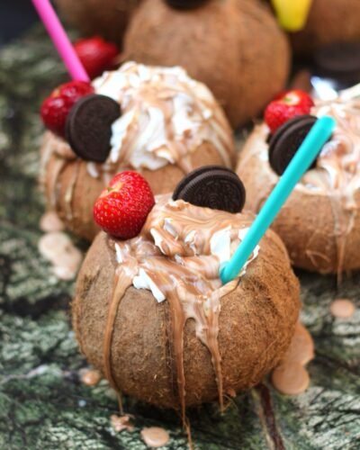 Hindistan cevizi sütü, Alman Nutellası, Oreo parçaları ve krema.