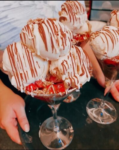 Dev dondurma topları, çıtır Corn Flakes, özel çikolata sosu ve çilek.