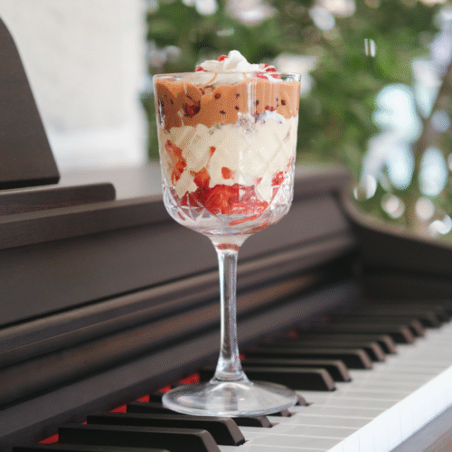 Eritilmiş sütlü Belçika Çikolatası, çilek, brownie parçaları, kavrulmuş tel kadayıf, Savoier Bisquit ve krema.